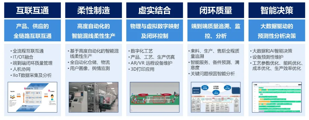 在联想的智能制造体系中,技术是推动智能变革的核心动力。基于对行业变革、技术演进深入的研究和理解,再结合自身的实践,联想总结出五大智能制造核心能力“互连互通、柔性制造、虚实结合、闭环质量、智能决策”。