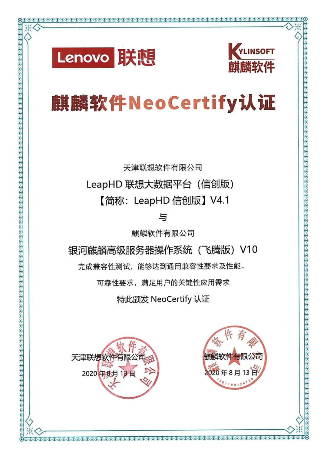 近日,由联想自主研发的软件产品——联想大数据平台LeapHD与银河麒麟高级服务器操作系统完成兼容性测试,达到了通用兼容性要求,及性能、可靠性要求,能够满足用户的关键性应用需求。联想大数据平台可以在ARM架构的飞腾芯片、国产麒麟操作系统上更好的为客户提供一站式大数据分析能力。